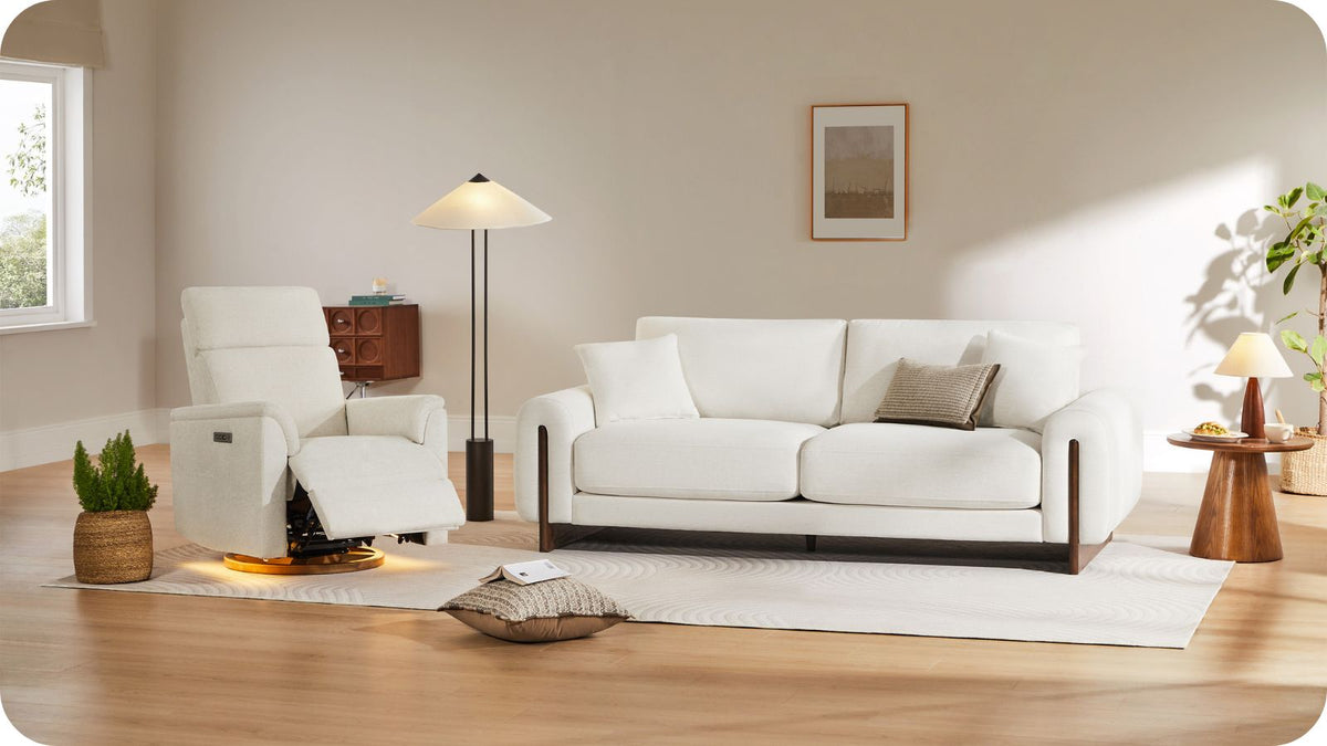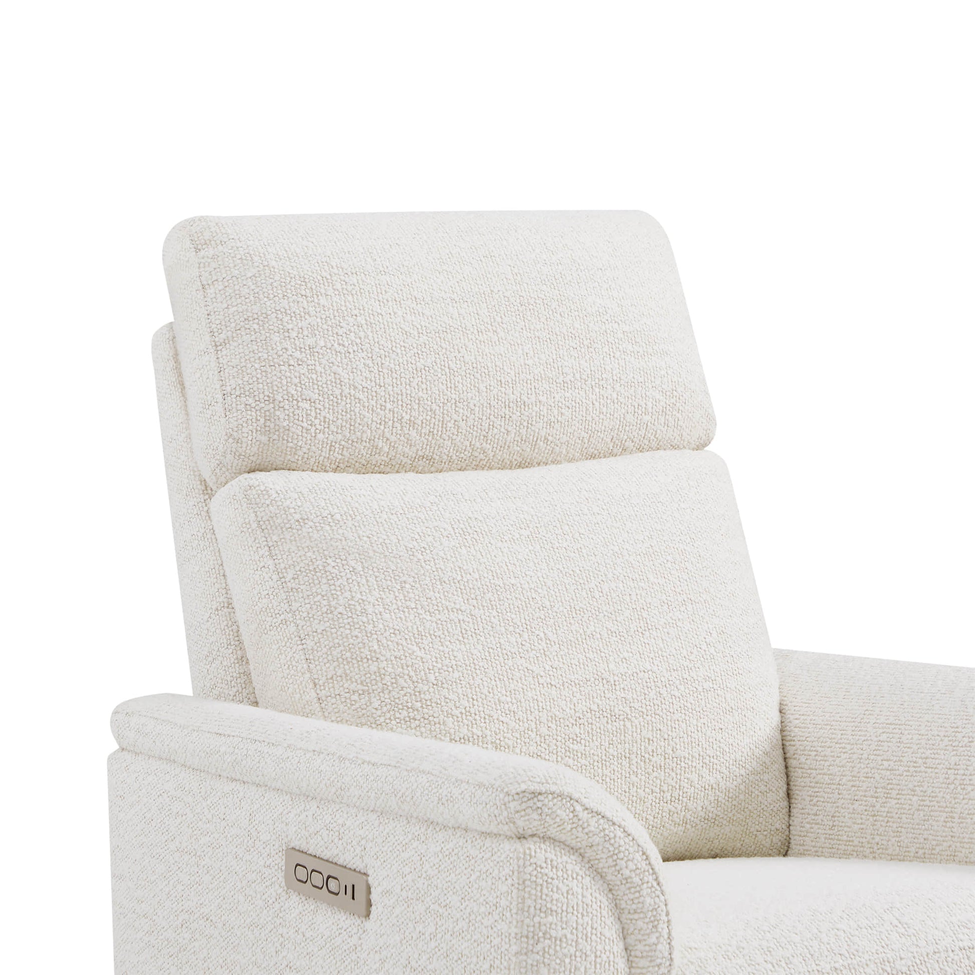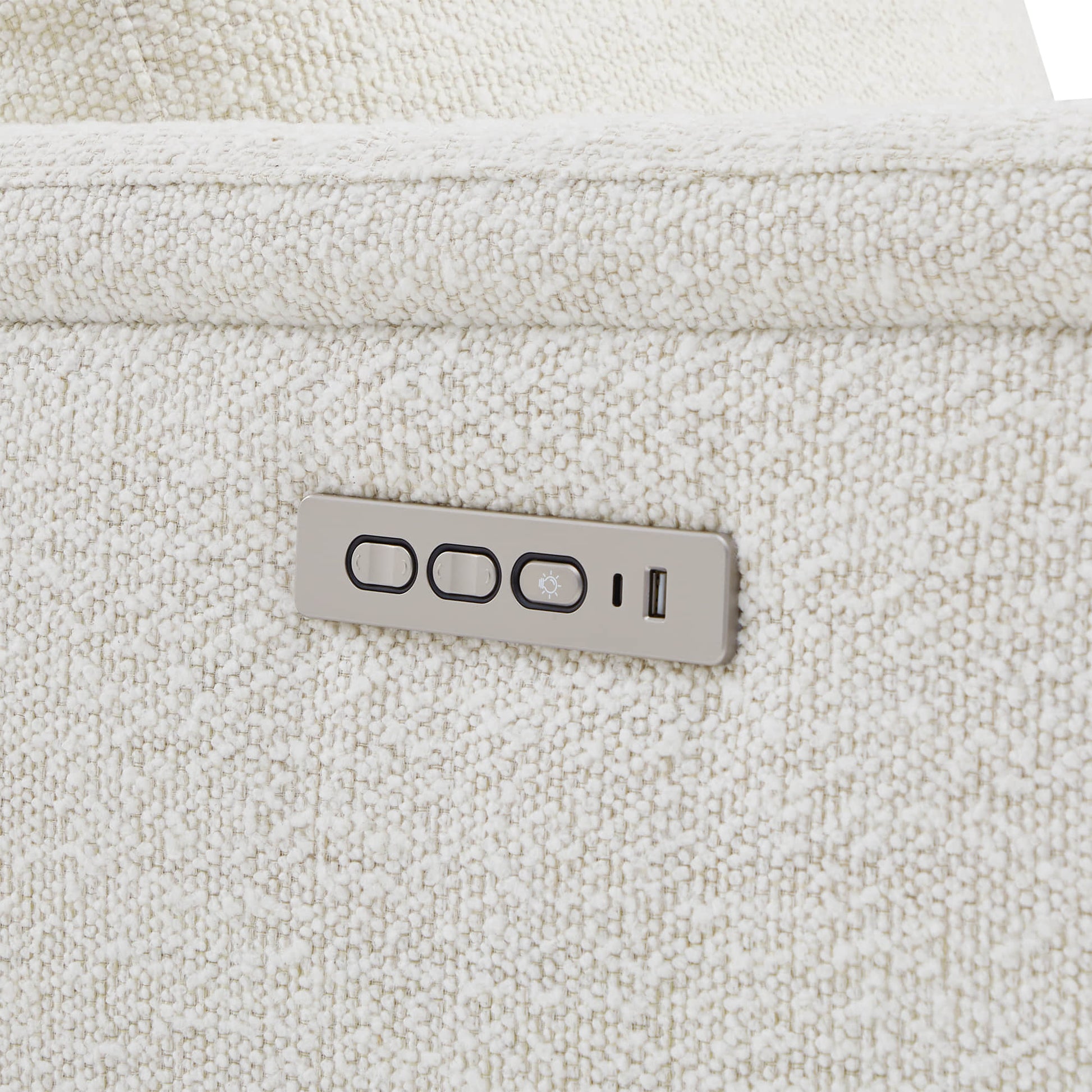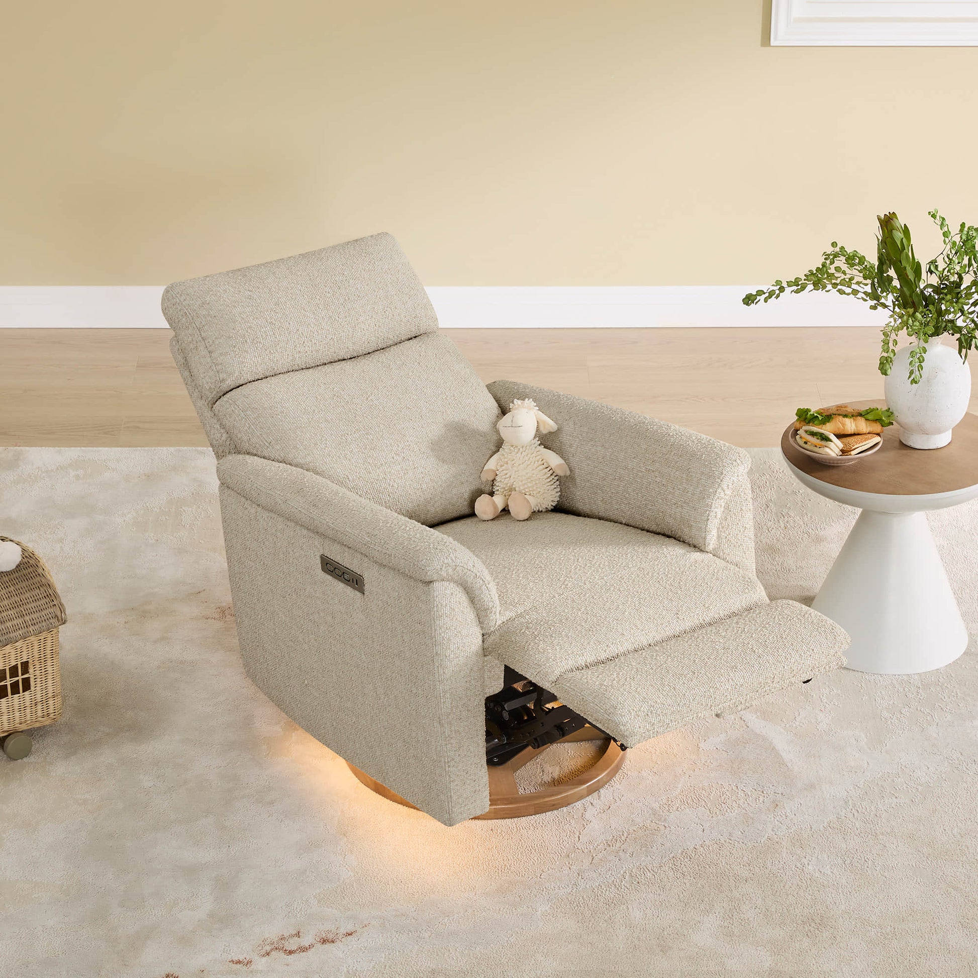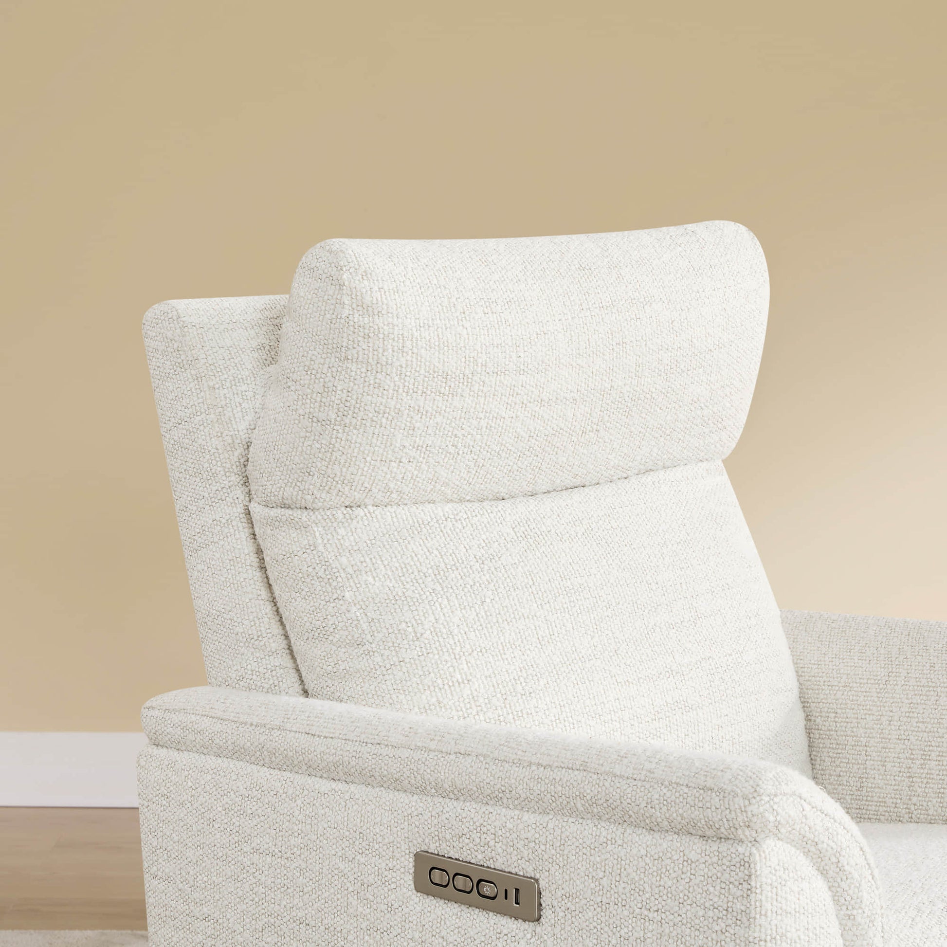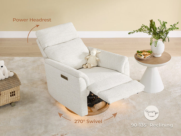 The Lulla recliner offers ultimate relaxation with a 270° swivel, smooth glide, and electric recline up to 135°. Its quiet, seamless mechanism adjusts effortlessly, maintaining a peaceful environment.